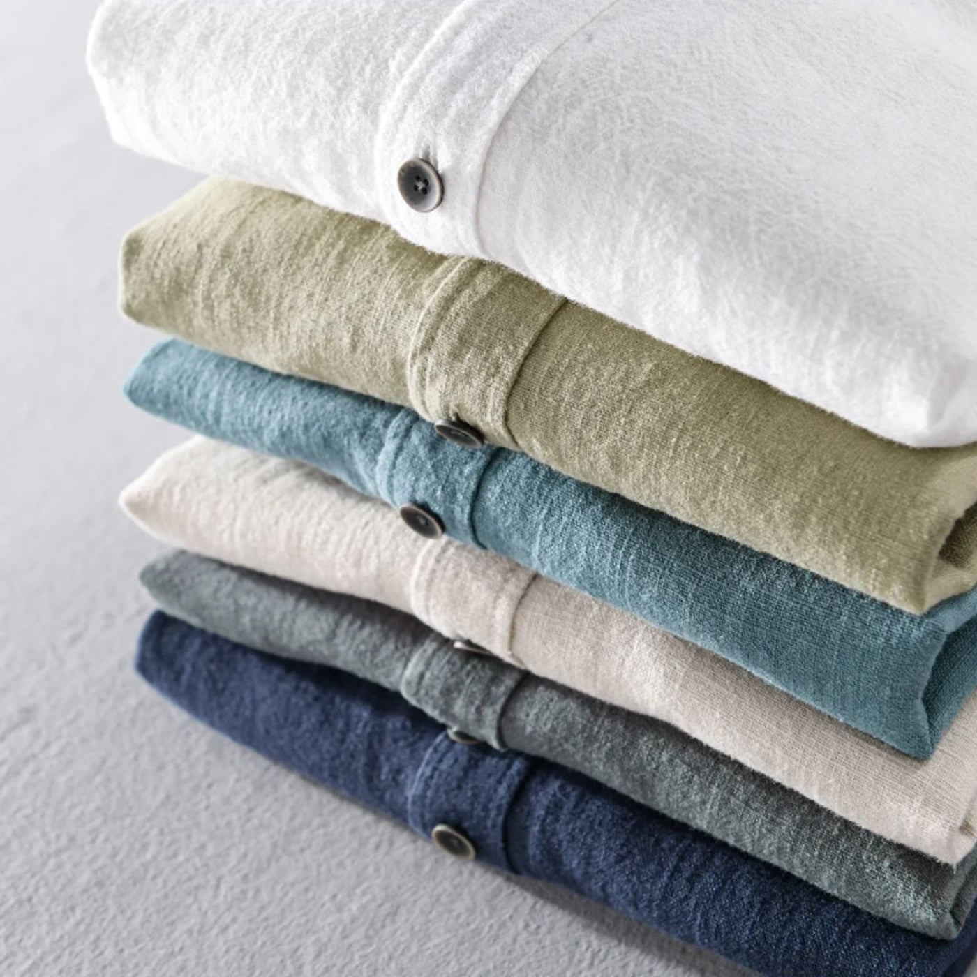 Χρησιμοποιούμε προσεκτικά επιλεγμένα υφάσματα — όπως βαμβάκι, λινό και ποιοτικά μίγματα — για άνεση και αντοχή. Κάποια κομμάτια περιλαμβάνουν συνθετικές ίνες (π.χ. polyester) για καλύτερη εφαρμογή και σταθερότητα.