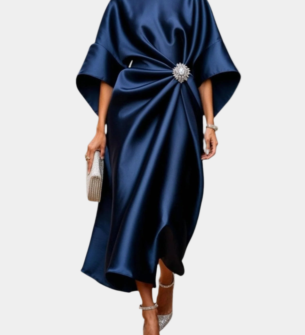 Αθηνά – Σατέν Φόρεμα με Πλαϊνές Πιέτες και Διακοσμητική Αγκράφα