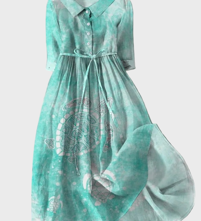 Νεφέλη – Τυρκουάζ Φόρεμα με Σχέδιο Θαλάσσιας Χελώνας και Ρομαντική Αίσθηση
