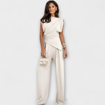 Μια εμπειρία στυλ που συνδυάζει την άνεση με την εκλεπτυσμένη αισθητική. Το μοναδικό σχέδιο με το ασύμμετρο τοπ και τα φαρδιά παντελόνια προσφέρει μια σιλουέτα που ρέει με χάρη, ιδανική για κάθε περίσταση. Το μαλακό ύφασμα με την ελαφριά πτώση και το σατινέ φινίρισμα αγκαλιάζει το σώμα, προσφέροντας αίσθηση πολυτέλειας και ευεξίας. Είτε για μια επίσημη έξοδο είτε για την καθημερινότητά σας, αυτό το σύνολο θα σας αναδείξει με κομψότητα.