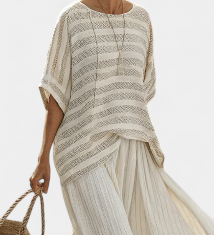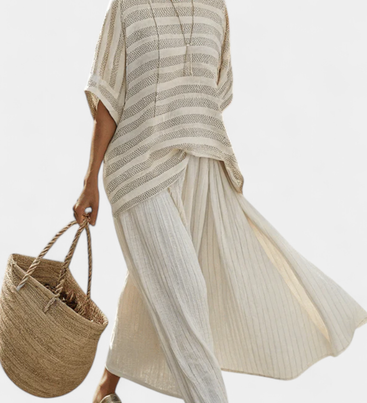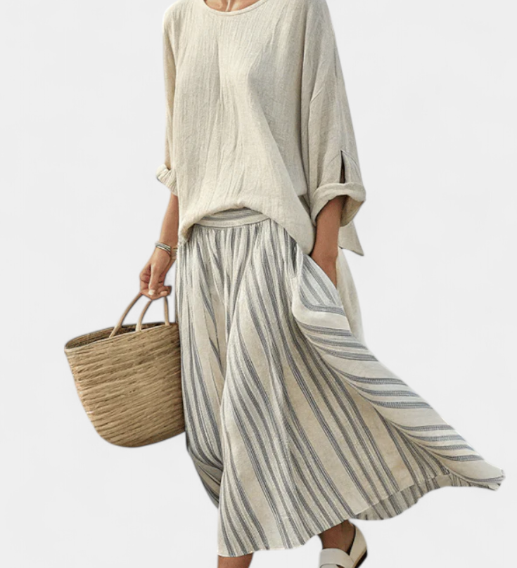 Θάλεια – Oversize Μπλούζα με Ρίγες και Λινή Midi Φούστα Daisy