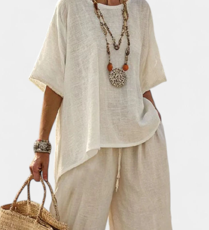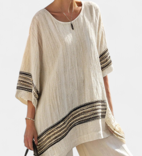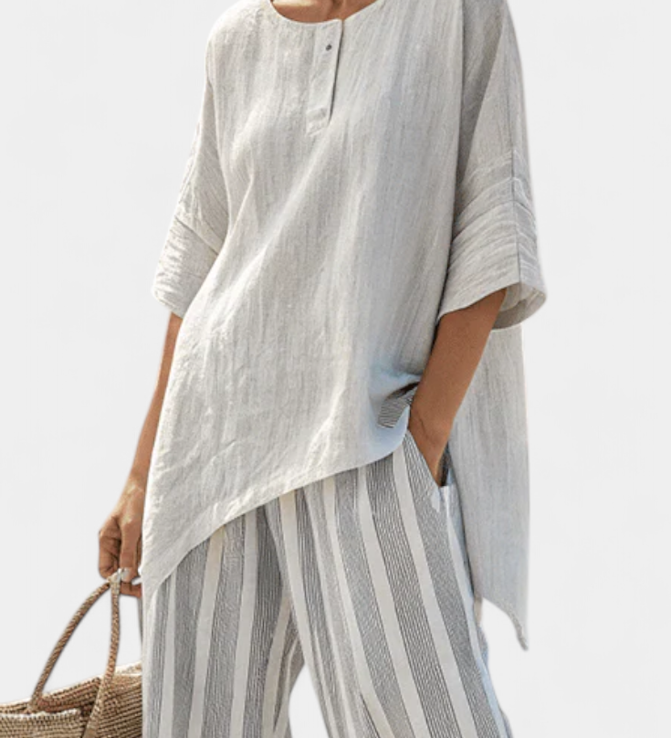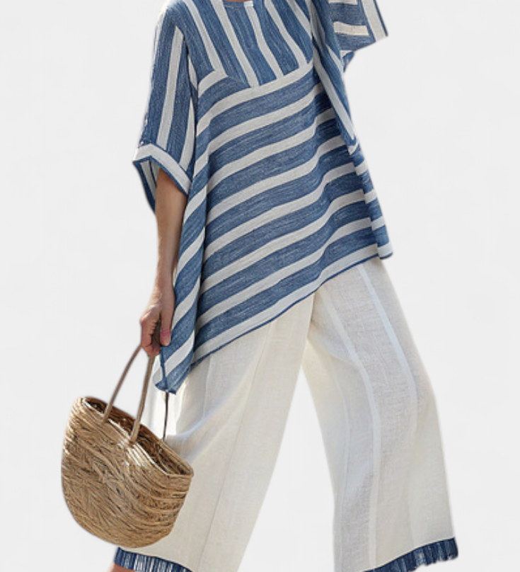 Θάλεια – Σετ Λινών Ριγέ Ρούχων με Ασύμμετρη Μπλούζα και Φαρδιά Παντελόνια