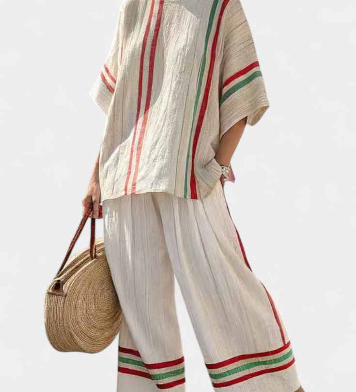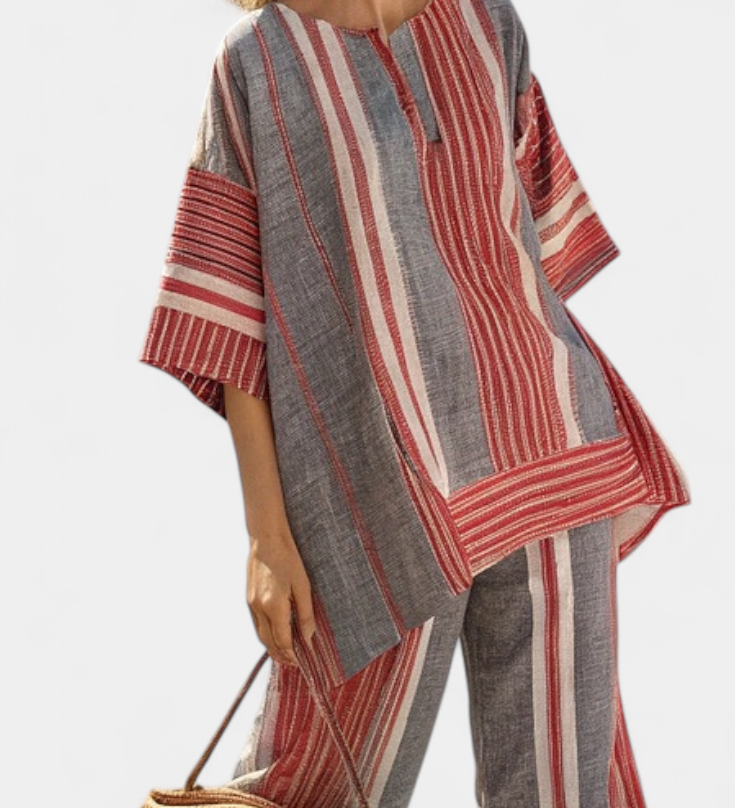 Θάλεια – Λινό Μπαμπού Σύνολο με Κομψές Ρίγες σε Κόκκινο και Πράσινο