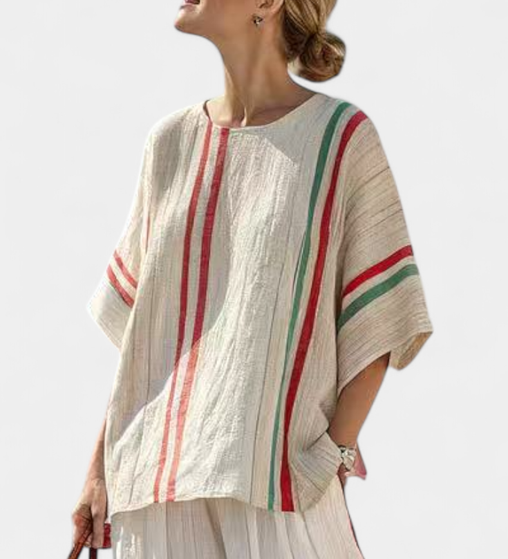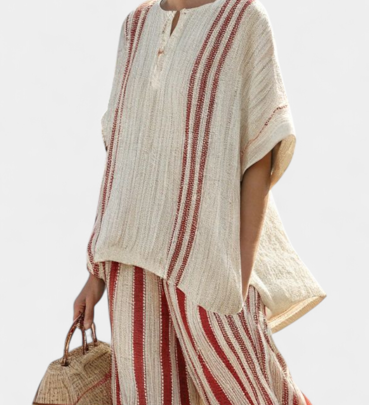Θάλεια – Λινό Μπαμπού Σύνολο Μεσογείου με Κομψές Ρίγες σε Κόκκινο και Πράσινο