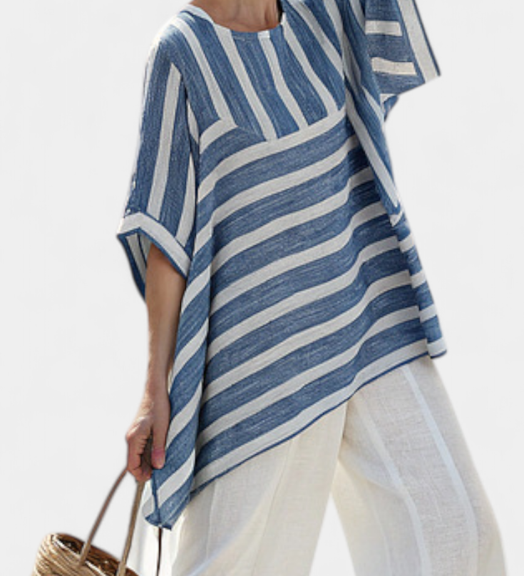 Θάλεια – Ασύμμετρη Μπλούζα με Ριγέ Παντελόνι για Κομψές Στιγμές