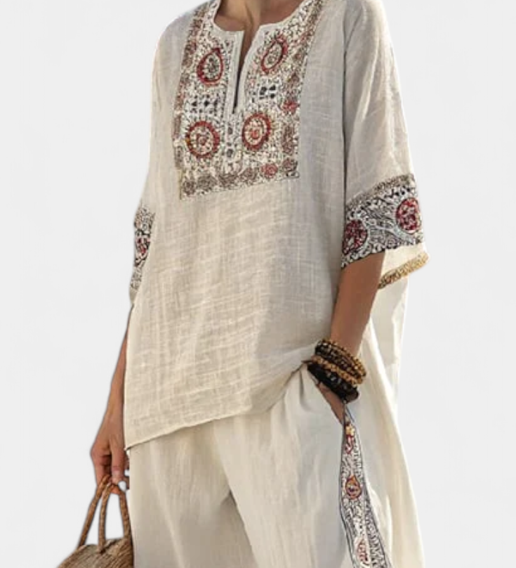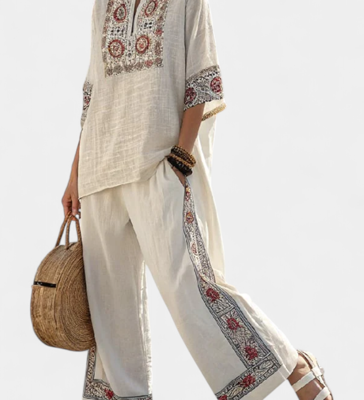 Θάλεια – Μπλούζα με Λουλούδια και Εκτυπωμένα Παντελόνια σε Μποέμ Στυλ