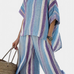 Η απόλυτη επιλογή για τις ζεστές ημέρες, συνδυάζει ρευστές γραμμές και χαλαρή εφαρμογή, προσφέροντας μια αίσθηση ελευθερίας σε κάθε κίνηση. Τα φαρδιά παντελόνια συνδυάζονται ιδανικά με την ελαφριά μπλούζα, δημιουργώντας μια ευχάριστη αίσθηση που αγκαλιάζει το σώμα. Κατασκευασμένο από ποιοτικό ύφασμα, ιδανικό για ευαίσθητες επιδερμίδες, αυτό το σύνολο είναι τέλειο για καθημερινές εξορμήσεις ή πιο επίσημες περιστάσεις.