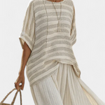 Η απόλυτη σύνθεση που συνδυάζει άνεση και στυλ, προσφέρει μια μοναδική αίσθηση ελευθερίας. Κατασκευασμένο από φυσικά υλικά, αυτό το σύνολο αγκαλιάζει το σώμα με απαλή υφή και ρευστή πτώση, ιδανικό για τις φωτεινές μέρες του καλοκαιριού. Η φαρδιά γραμμή και οι υφασμάτινες ρίγες προσθέτουν μια καλοκαιρινή και χειροποίητη αίσθηση, κάνοντάς το κατάλληλο για κάθε casual ή επίσημη περίσταση.