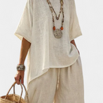 Η κομψότητα συναντά την απλότητα σε ένα σύνολο που αποπνέει φρεσκάδα και ελευθερία. Κατασκευασμένο από ελαφρύ ύφασμα, προσφέρει μια χαλαρή σιλουέτα που αγκαλιάζει το σώμα, επιτρέποντας κάθε κίνηση με άνεση. Ιδανικό για καθημερινές εμφανίσεις ή για ιδιαίτερες περιστάσεις, συνδυάζει την ποιότητα με μια αίσθηση ηρεμίας και ισορροπίας, καθιστώντας το απαραίτητο κομμάτι για τις ζεστές ημέρες.