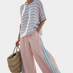 Η μοναδική σύνθεση του υλικού προσφέρει απαλή αίσθηση στο δέρμα, ενώ η φαρδιά σιλουέτα εξασφαλίζει ελευθερία κινήσεων και άνεση σε κάθε σας βήμα. Ιδανικό για ηλιόλουστες ημέρες και χαλαρές αποδράσεις, το σύνολο αυτό συνδυάζει την κομψότητα με την πρακτικότητα, επιτρέποντας να αναδείξετε την προσωπικότητά σας σε κάθε περίσταση. Η διαπνέουσα υφή του λινό μπαμπού το καθιστά ιδανικό για ζεστά κλίματα, προσφέροντας μια φρέσκια και ανάλαφρη αίσθηση.