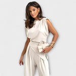 Μια εμπειρία στυλ που συνδυάζει την άνεση με την εκλεπτυσμένη αισθητική. Το μοναδικό σχέδιο με το ασύμμετρο τοπ και τα φαρδιά παντελόνια προσφέρει μια σιλουέτα που ρέει με χάρη, ιδανική για κάθε περίσταση. Το μαλακό ύφασμα με την ελαφριά πτώση και το σατινέ φινίρισμα αγκαλιάζει το σώμα, προσφέροντας αίσθηση πολυτέλειας και ευεξίας. Είτε για μια επίσημη έξοδο είτε για την καθημερινότητά σας, αυτό το σύνολο θα σας αναδείξει με κομψότητα.