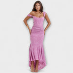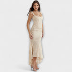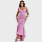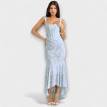 Η απόλυτη σύνθεση κομψότητας και άνεσης, αυτό το φόρεμα αγκαλιάζει τη σιλουέτα σας με χάρη και στυλ. Κατασκευασμένο από ανάλαφρο ύφασμα με διακριτικό μοτίβο, προσφέρει μια ρομαντική αίσθηση που είναι ιδανική για κάθε ιδιαίτερη περίσταση. Η τετράγωνη λαιμόκοψη και οι λεπτομέρειες του κορσέ τονίζουν τη μέση, ενώ η ασύμμετρη φούστα προσθέτει κίνηση σε κάθε σας βήμα, κάνοντάς σας να νιώθετε μοναδική.