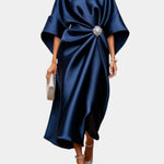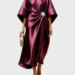 Αθηνά – Σατέν Φόρεμα με Πλαϊνές Πιέτες και Διακοσμητική Αγκράφα