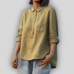 Αυτή η μπλούζα προσφέρει μια μοναδική αίσθηση άνεσης και στυλ, ιδανική για κάθε στιγμή της ημέρας. Κατασκευασμένη από υψηλής ποιότητας λινό, συνδυάζει την κλασική κομψότητα με τη σύγχρονη πρακτικότητα. Ο κλασικός γιακάς και τα μακριά μανίκια με επιλογή αναδίπλωσης προσθέτουν μία διακριτική φινέτσα, ενώ η χαλαρή εφαρμογή εξασφαλίζει ελευθερία κινήσεων, κάνοντάς την ιδανική για καθημερινές ή πιο επίσημες περιστάσεις.