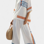 Η αίσθηση της άνεσης συναντά την εκλεπτυσμένη κομψότητα σε ένα σύνολο που αποπνέει φρεσκάδα και ελευθερία κινήσεων. Κατασκευασμένο από εξαιρετικής ποιότητας ύφασμα μπαμπού-λινο, αυτό το ενδύμα προσφέρει μοναδική αίσθηση στο δέρμα, ιδανικό για ζεστά κλίματα. Η φαρδιά μπλούζα με στρογγυλή λαιμόκοψη και τα παντελόνια που ρέουν ελεύθερα δημιουργούν μια σιλουέτα που αποπνέει στυλ και αυτοπεποίθηση, ιδανικό για καθημερινές ή επίσημες περιστάσεις.