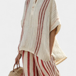 Η αίσθηση της ελευθερίας και της κομψότητας συνδυάζονται σε ένα μοναδικό σύνολο, ιδανικό για τις ζεστές μέρες. Το ρευστό ύφασμα και η άνετη γραμμή προσφέρουν μια απαλή αίσθηση στο δέρμα, ενώ οι κατακόρυφες ρίγες προσδίδουν μια διαχρονική σιλουέτα. Ιδανικό για καθημερινές εξόδους ή χαλαρές στιγμές στην παραλία, αυτό το σύνολο αποπνέει στυλ και φινέτσα, κάνοντάς σας να νιώθετε άνετα και κομψά σε κάθε σας βήμα.