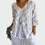 Αυτή η μπλούζα συνδυάζει την άνεση με την κομψότητα, προσφέροντας μια αίσθηση ελευθερίας σε κάθε σας κίνηση. Το V-λαιμόκοψη ενισχύει τη θηλυκότητα, ενώ το ανάλαφρο ύφασμα την καθιστά ιδανική επιλογή για καθημερινές αλλά και πιο επίσημες περιστάσεις. Οι λεπτομέρειες με τις μαύρες γραμμές και τα πουά μοτίβα προσθέτουν μια μοντέρνα πινελιά, κάνοντάς την ευέλικτη και εύκολη στο συνδυασμό με παντελόνια, φούστες ή σορτς.