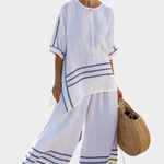 Η αίσθηση της ελευθερίας και της κομψότητας συνδυάζεται τέλεια σε αυτό το μοναδικό κομμάτι. Κατασκευασμένο από ένα ελαφρύ μείγμα βαμβακιού και λινών, προσφέρει μια αβίαστη φρεσκάδα καθ' όλη τη διάρκεια της ημέρας. Η φαρδιά σιλουέτα και οι διακριτές ανοιχτές φάσεις επιτρέπουν κίνηση, ενώ οι οριζόντιες ρίγες προσθέτουν μια διακριτική κομψότητα. Ιδανικό για χαλαρές βόλτες ή καλοκαιρινές εξορμήσεις, αποπνέει έναν φυσικό και σύγχρονο αέρα.