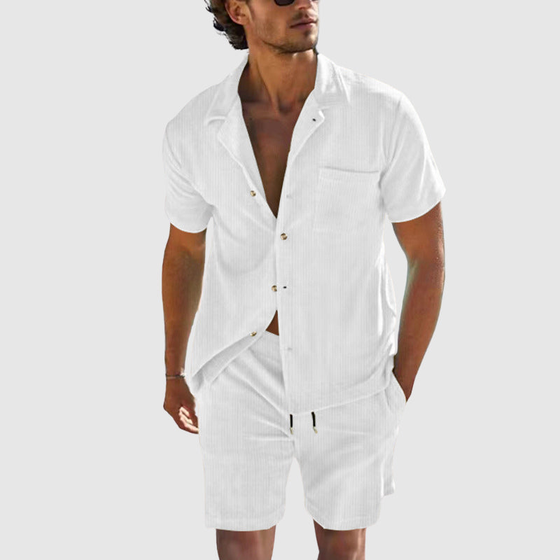 Αφεθείτε στη μαγεία του καλοκαιριού με ένα σύνολο που συνδυάζει άνεση και κομψότητα. Κατασκευασμένο από ελαφρύ και αναπνεύσιμο πολυμερές μίγμα, προσφέρει απαλή αίσθηση στο δέρμα και ελευθερία κίνησης. Η λεπτή κάθετη υφή προσθέτει μια διακριτική αίσθηση πολυτέλειας, ενώ η χαλαρή γραμμή του επιτρέπει να προσαρμόζεται σε κάθε περίσταση, από τις καθημερινές βόλτες μέχρι τις πιο επίσημες εξόδους.